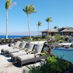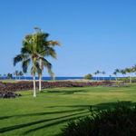 The Pacific Ocean and bright blue skies form the backdrop. The gorgeous fairway and swaying palm trees of the signature 7th hole of the Waikoloa Beach Resort golf course dominate the foreground. The combination is stunning.